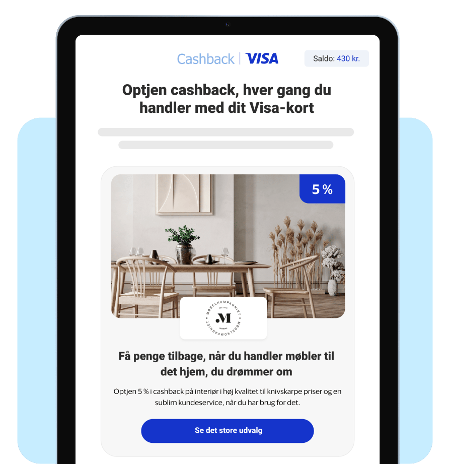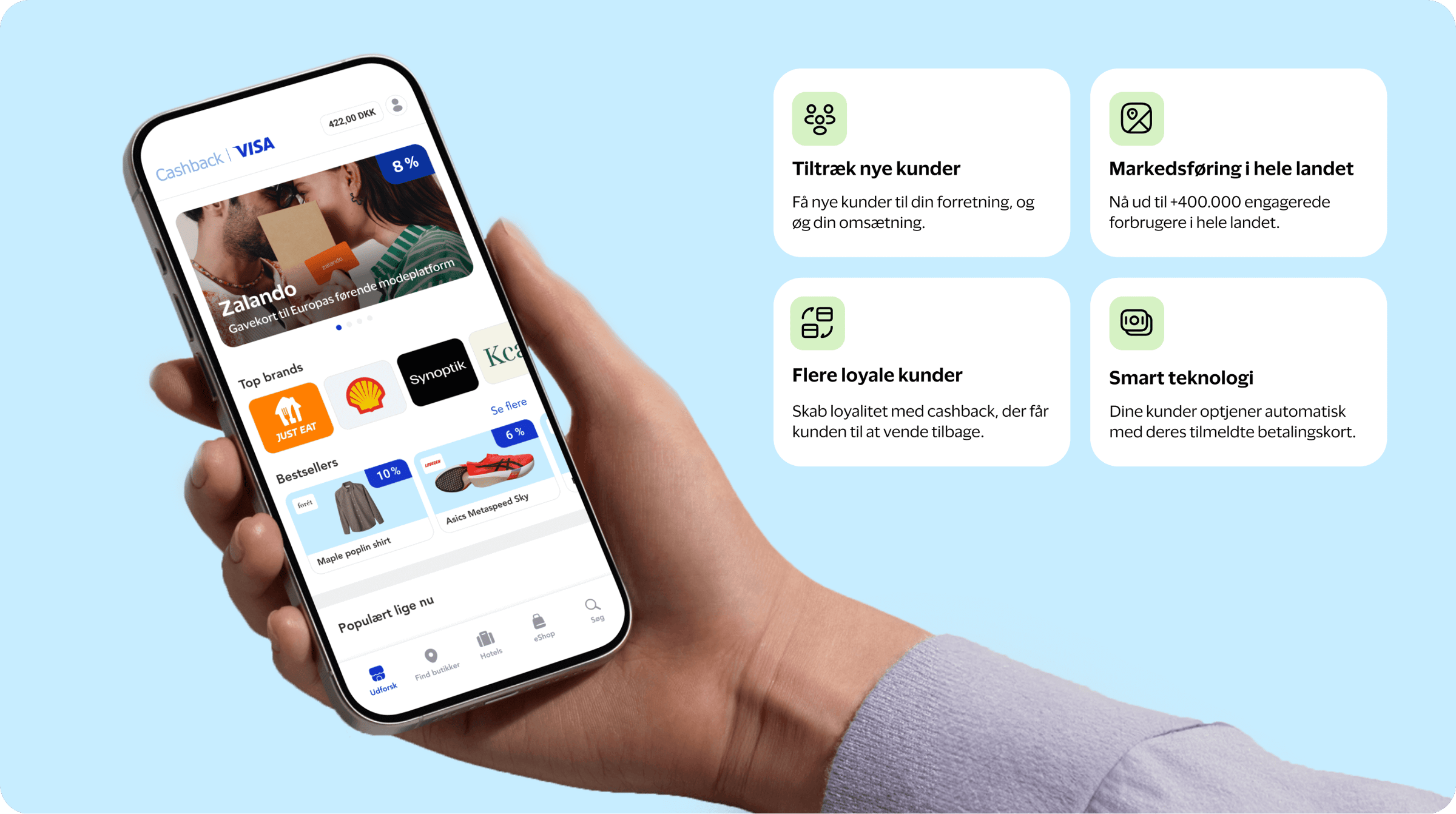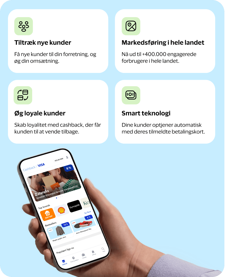 Bliv markedsført direkte til +400.000 købestærke medlemmer, og få flere kunder uden besvær. Som en del af Cashback med Visa opnår du synlighed, loyalitet og mersalg – helt automatisk.